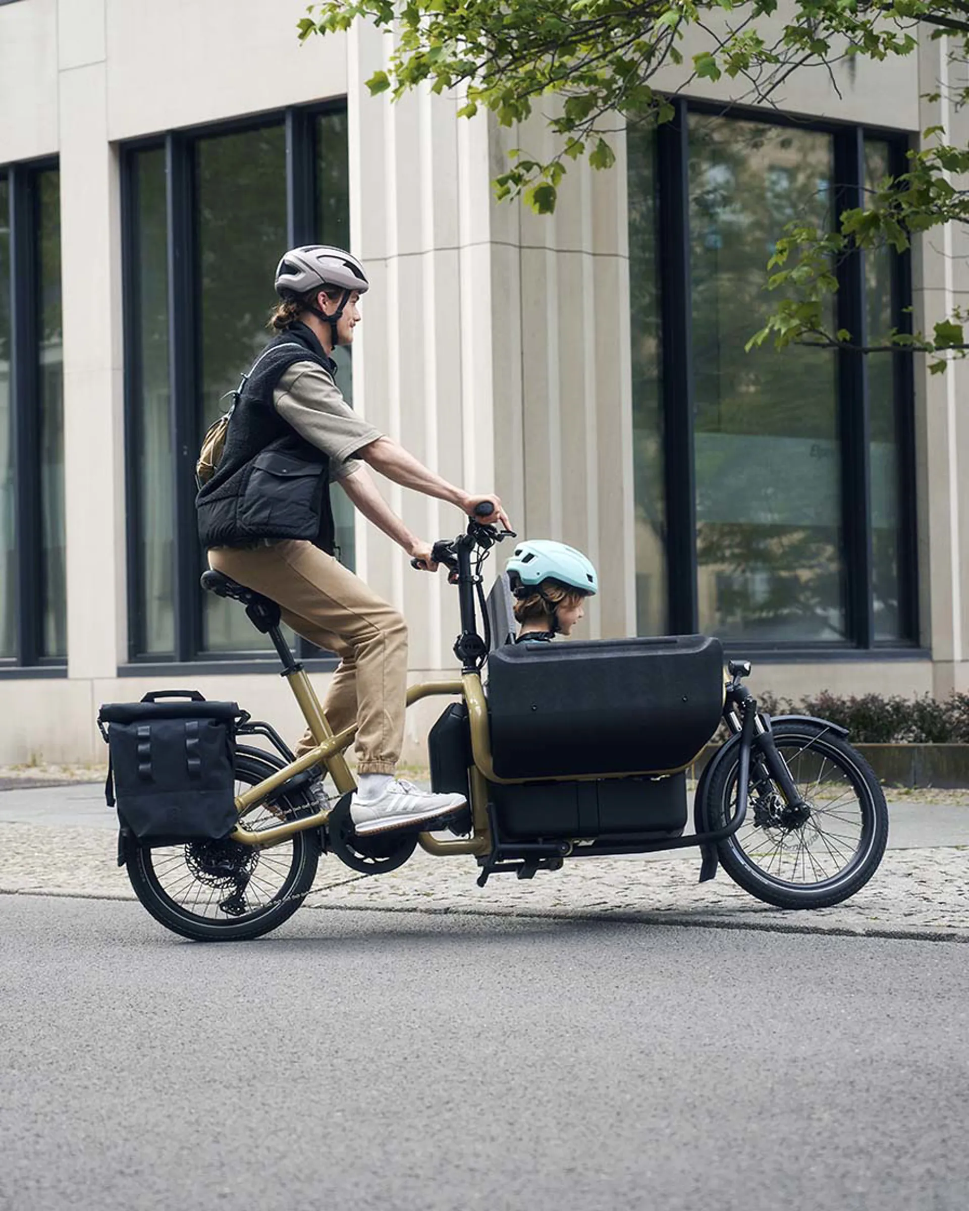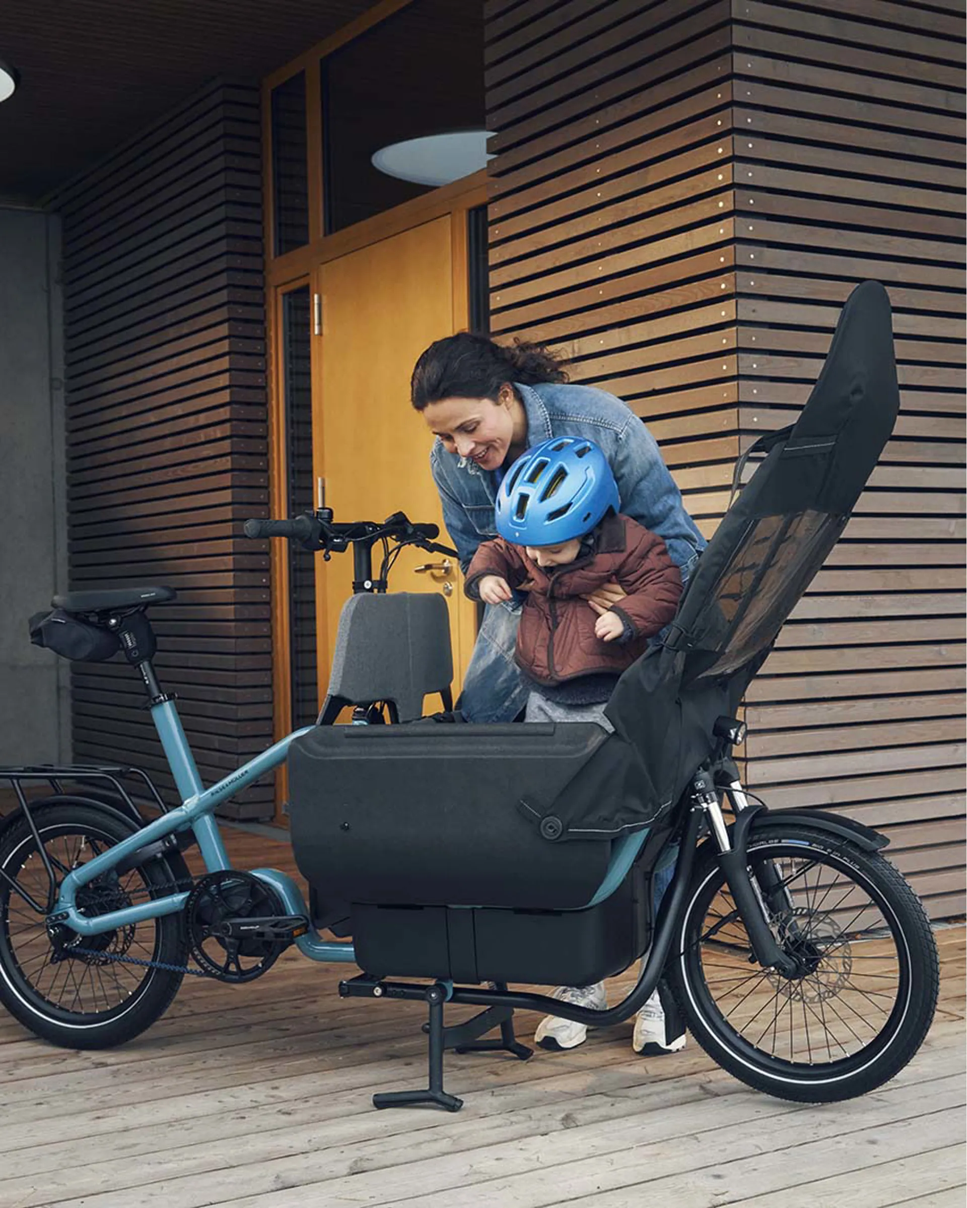 With the Flex Box, its name says it all: when collapsed, it holds a regular drinks crate, and even up to three when folded out. The box can be securely locked and extended with a high-quality cargo bag. You can carry your little ones in an adjustable child seat with a protective cover.